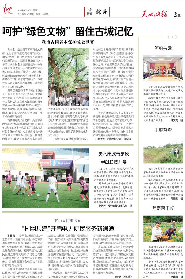古树名木是森林资源中的瑰宝,对古树名木进行保护和管理,具有极其重要的历史、文化、生态价值。秦安县为了解决普渡寺千年白皮松因地面硬化影响正常生长的问题,专门制定保护方案,专业团队落实了救护措施。张家川县对马鹿镇康王村古梨树等30余株古树进行了围栏、修枝整形保护和复壮工程。近年来,全市共落实保护管理经费300万元,积极开展古树名木保护修复。据市林草局资料显示,今年来,市绿委会办公室发起“保护古树名木,守护绿色遗产—天水市义务植树公益募捐项目”,广泛动员社会力量关注、参与和投入古树名木保护。已募捐资金额达到60万元,募捐人数达到22819人,为保护古树名木提供了有力支撑。