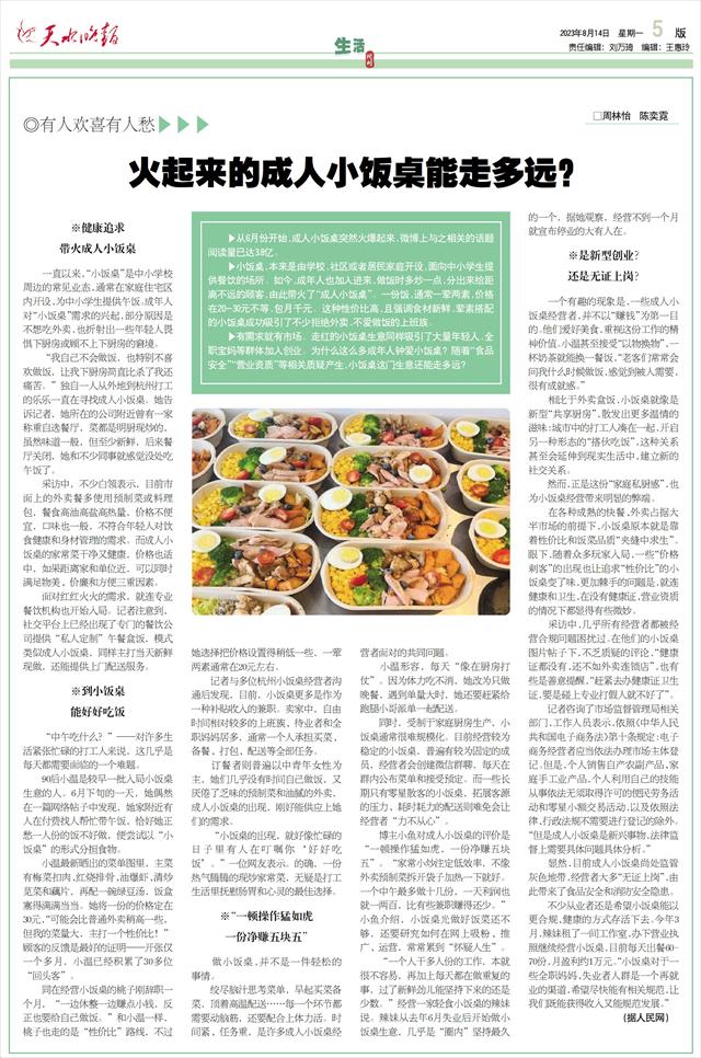 “我自己不会做饭,也特别不喜欢做饭,让我下厨房简直比杀了我还痛苦。”独自一人从外地到杭州打工的乐乐一直在寻找成人小饭桌。她告诉记者,她所在的公司附近曾有一家称重自选餐厅,菜都是明厨现炒的,虽然味道一般,但至少新鲜,后来餐厅关闭,她和不少同事就感觉没处吃午饭了。