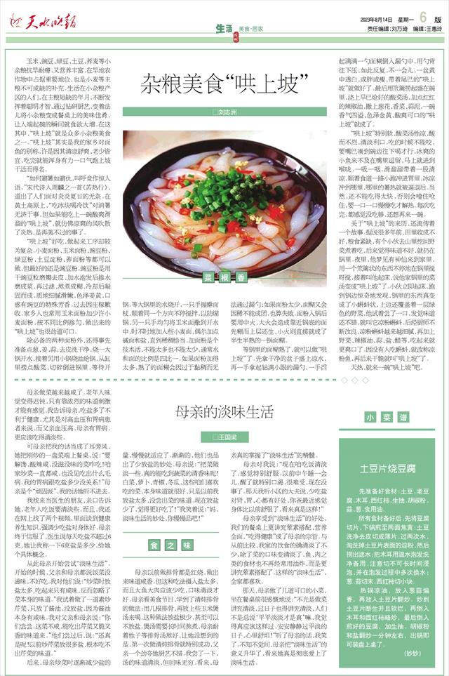 杂粮美食“哄上坡”□刘志洲   玉米、豌豆、绿豆、土豆、荞麦等小杂粮抗旱耐瘠,又营养丰富,在旱地农作物中占据重要地位,也是小麦等主粮不可或缺的补充。生活在小杂粮产区的人们,在主粮短缺的年月,不断发挥着聪明才智,通过钻研厨艺,变着法儿将小杂粮变成餐桌上的美味佳肴,让人端起碗的瞬间就食欲大增。在这其中,“哄上坡”就是众多小杂粮美食之一。“哄上坡”其实是我的家乡对面鱼的别称,许是因其清凉舒爽、老少皆宜,吃完就能浑身有力一口气跑上坡干活而得名。