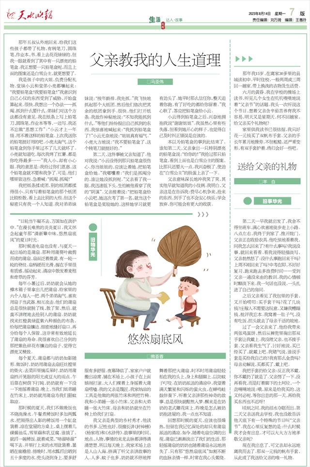 我父亲是典型的乡村秀才,他读的书多,记性也好,很擅长讲《封神榜》《杨家将》和《水浒传》。故事里的时间、地点、人物、事情的来龙去脉都讲得清清楚楚,所以每天晚上,我家禾场上总是人山人海,挤满了听父亲讲故事的人。人多,蚊子也多,奶奶就不停地挥舞着那把大蒲扇,时不时用蒲扇轻轻拍在我的头上、身上和腿脚上,以防蚊子叮咬。在奶奶派送的清凉中,我望着满天繁星和闪烁的萤火虫,在蝉鸣蛙鼓伴奏下,听着父亲讲那些神奇的故事,总是很快就酣然入梦。醒来是在奶奶的老式雕花床上,昨晚是怎么被奶奶抱进屋的,我一点也不知道。
