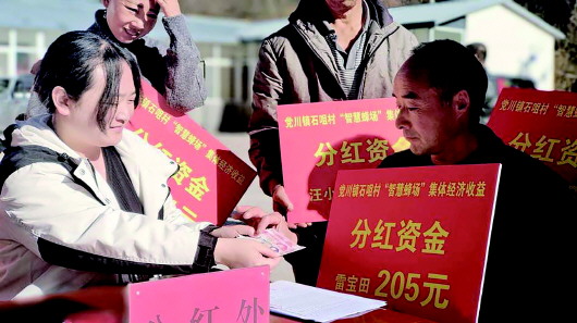 11月17日下午,麦积区党川镇石咀村举行“智慧蜂场”集体经济收益分红大会。分红大会现场,工作人员为村民耐心讲解流程和钱款数额,大家喜滋滋地领取属于自己的分红款,村民们手中举着醒目的红色分红信息牌,满脸喜悦。