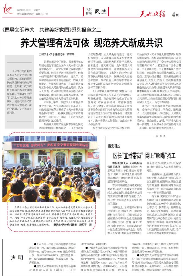 犬只的行为折射的是养犬人的文明意识和文明行为,反映的是居民的素质和城市的文明程度。近年来,我市积极开展城市养犬管理创新实践,于2021年出台了《天水市养犬管理条例》,使得我市养犬管理工作步入规范化、法治化轨道,文明养犬有法可依。