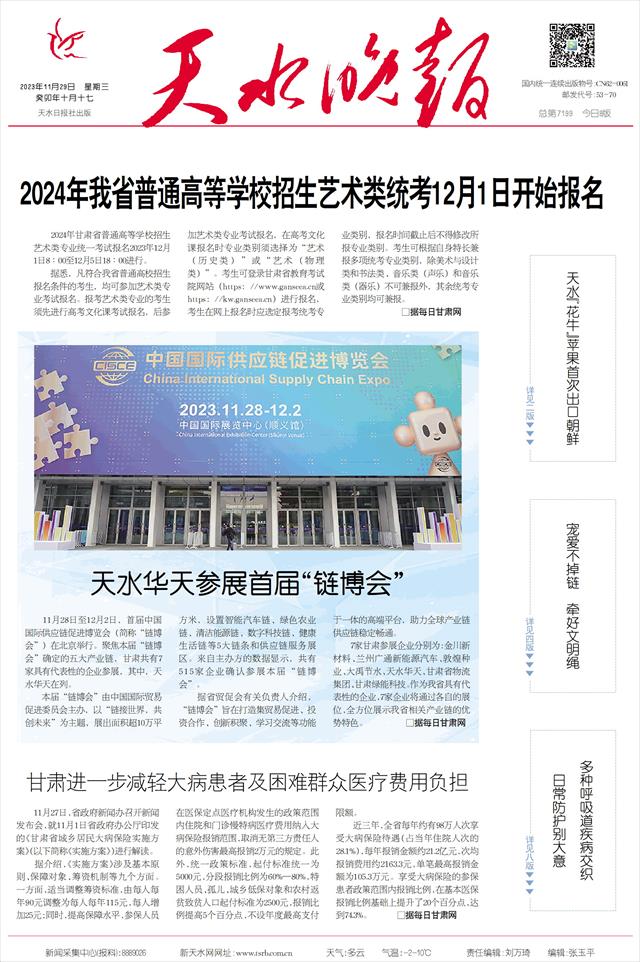 天水华天参展首届“链博会”   11月28日至12月2日,首届中国国际供应链促进博览会(简称“链博会”)在北京举行。聚焦本届“链博会”确定的五大产业链,甘肃共有7家具有代表性的企业参展,其中,天水华天在列。