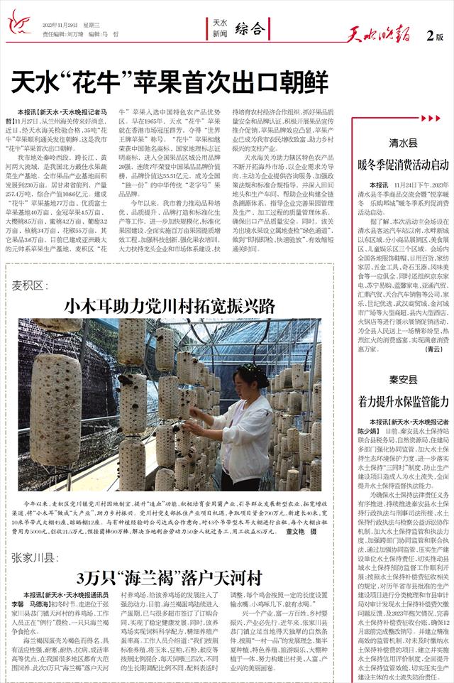 张家川县: 3万只“海兰褐”落户天河村   本报讯【新天水·天水晚报通讯员李馨 马德海】初冬时节,走进位于张家川县恭门镇天河村的养鸡场,工作人员正在“例行”晨检,一只只海兰褐争食抢水。