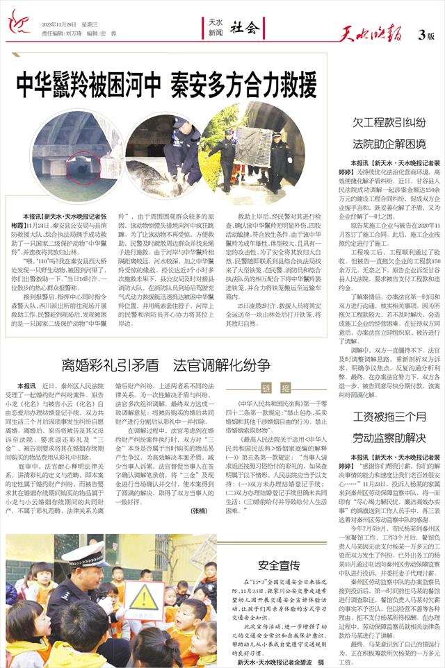 “喂,‘110’吗?我在秦安县西大桥处发现一只野生动物,被困到河里了,你们出警救助一下。”当日16时许,一位散步的热心群众报警称。