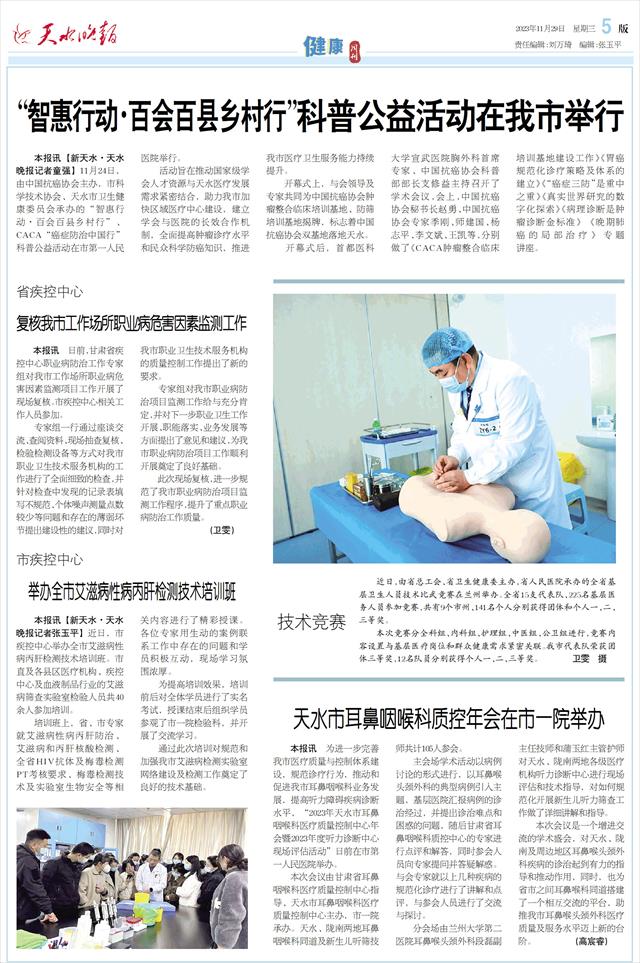 “智惠行动·百会百县乡村行”科普公益活动在我市举行   本报讯【新天水·天水晚报记者童强】11月24日,由中国抗癌协会主办,市科学技术协会、天水市卫生健康委员会承办的“智惠行动·百会百县乡村行”、CACA“癌症防治中国行”科普公益活动在市第一人民医院举行。