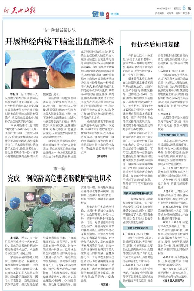 市一院甘谷帮扶队 开展神经内镜下脑室出血清除术   本报讯 近日,市第一人民医院甘谷帮扶队队长神经外科主治医师刘迎锋对一名自发性脑干出血破入脑室,脑室铸型患者行神经内镜下微创脑室血肿清除加侧脑室引流术,成功挽救患者生命,填补了县医院该项技术空白。