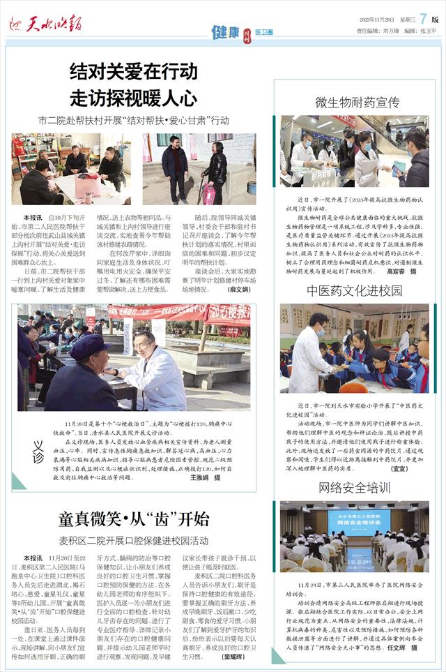 童真微笑?从“齿”开始 麦积区二院开展口腔保健进校园活动   本报讯 11月20日至22日,麦积区第二人民医院(马跑泉中心卫生院)口腔科医务人员先后走进渭北、褐石培心、慈爱、童星礼仪、童星等5所幼儿园,开展“童真微笑·从‘齿’开始”口腔保健进校园活动。
