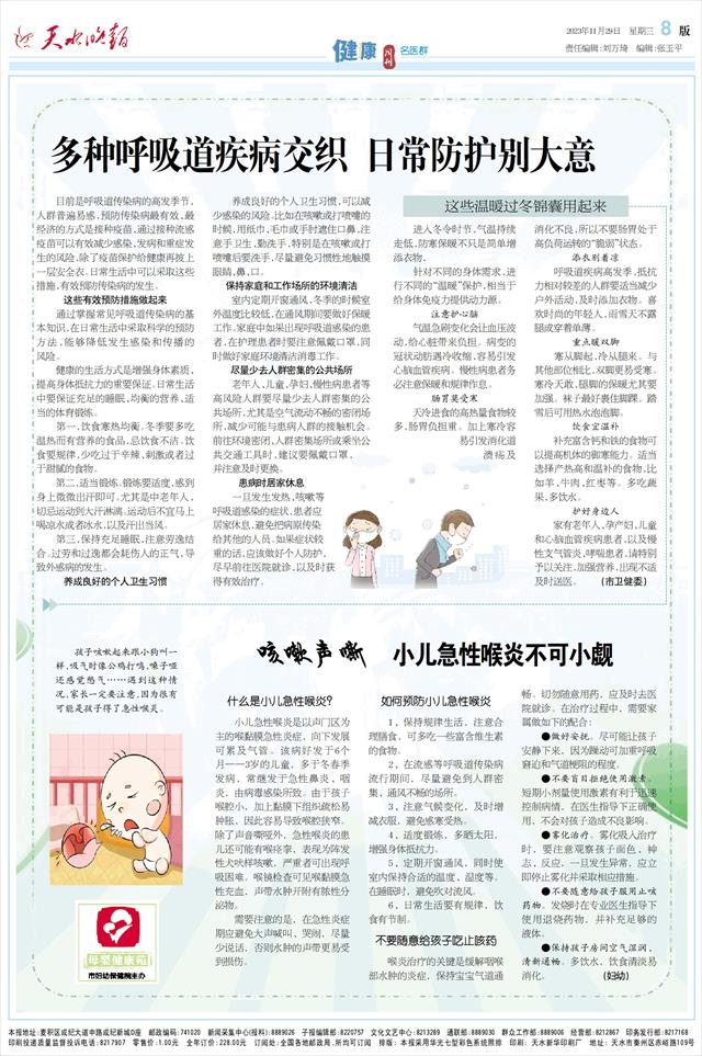 呼吸道疾病高发季,抵抗力相对较差的人群要适当减少户外活动,及时添加衣物。喜欢时尚的年轻人,雨雪天不露腿或穿着单薄。