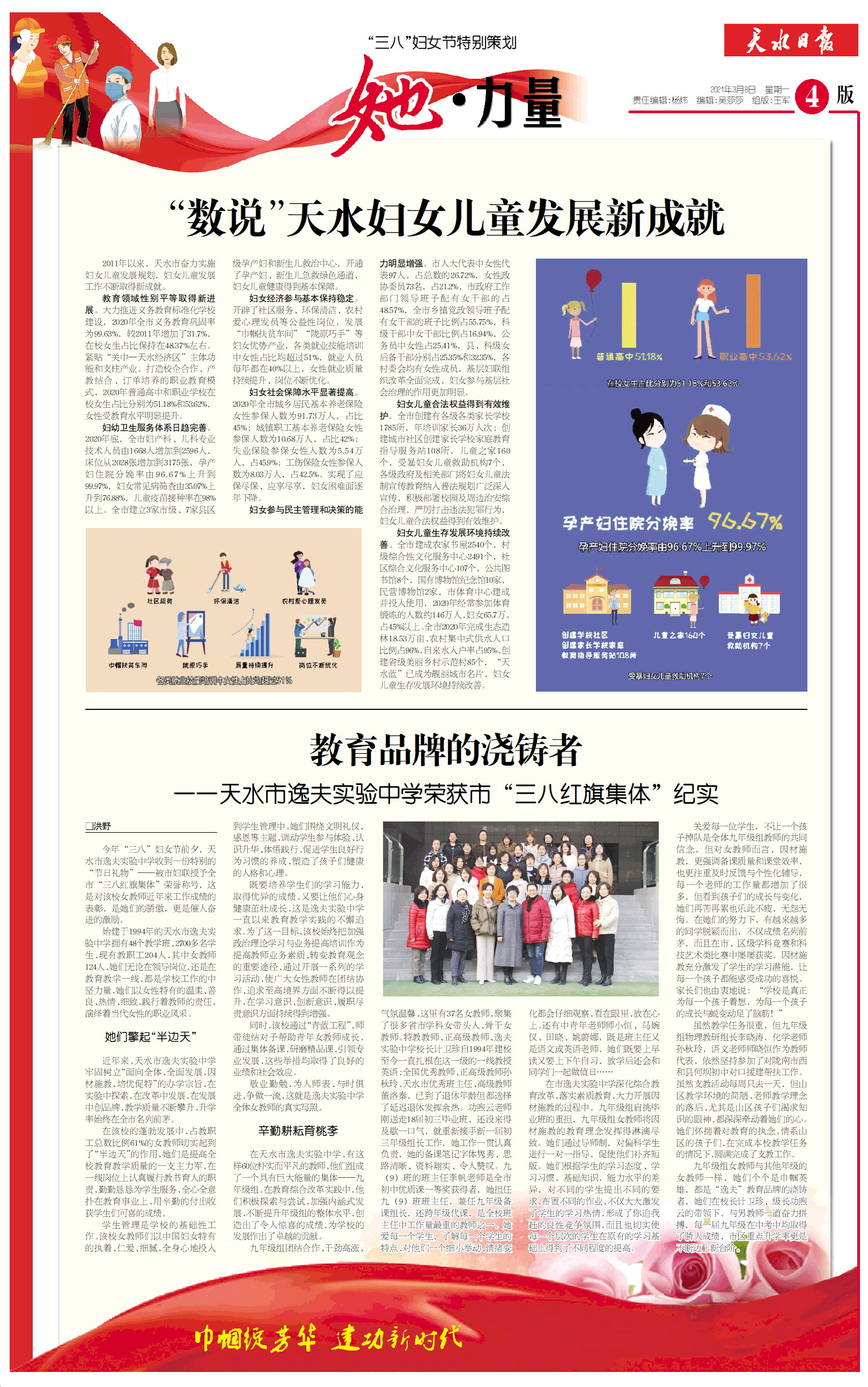 始建于1994年的天水市逸夫实验中学拥有48个教学班,2700多名学生,现有教职工204人,其中女教师124人,她们无论在领导岗位,还是在教育教学一线,都是学校工作的中坚力量,她们以女性特有的温柔、善良、热情、细致,践行着教师的责任,演绎着当代女性的职业风采。