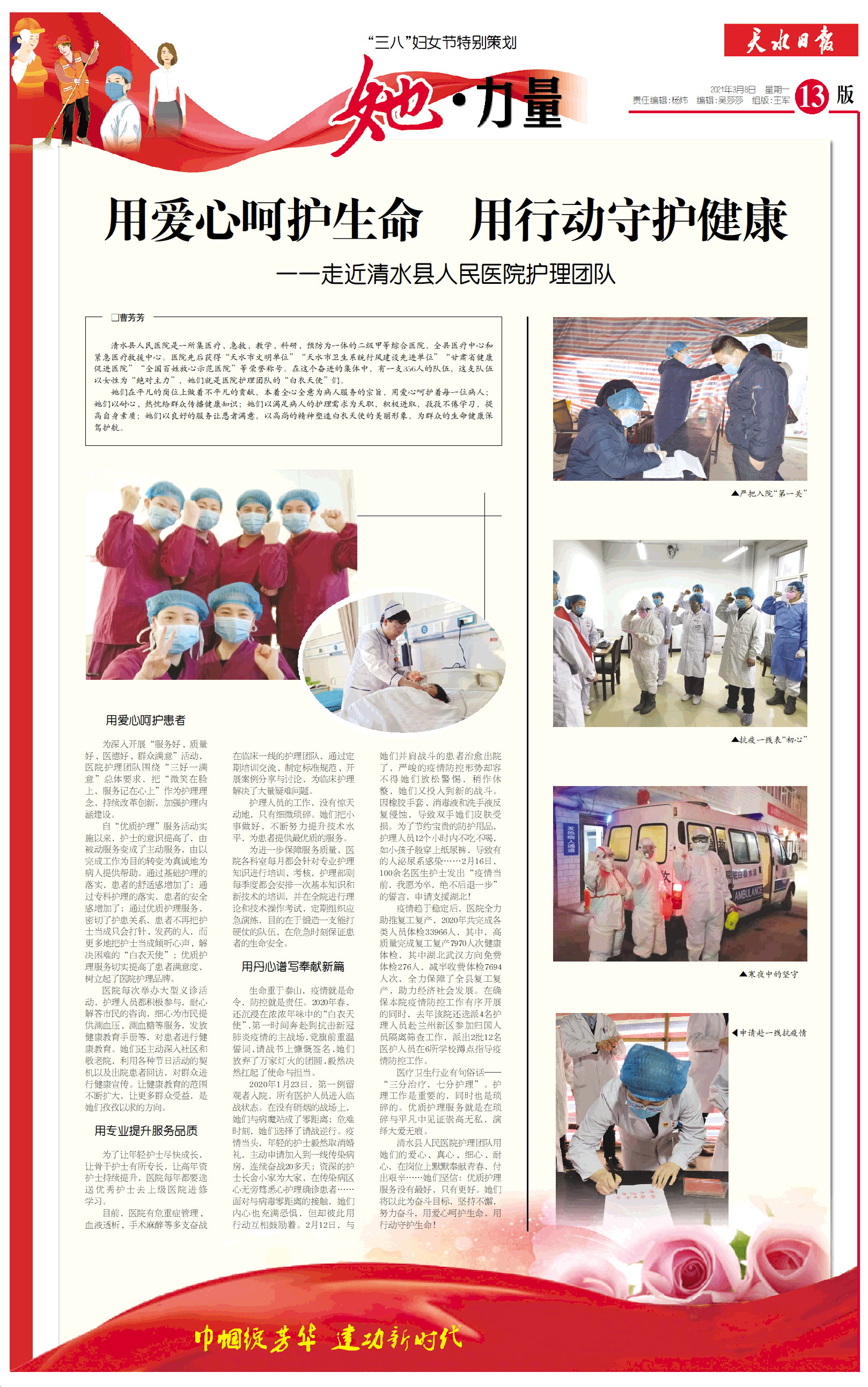 清水县人民医院护理团队用她们的爱心、真心、细心、耐心,在岗位上默默奉献青春,付出艰辛……她们坚信:优质护理服务没有最好,只有更好。她们将以此为奋斗目标,坚持不懈,努力奋斗,用爱心呵护生命,用行动守护生命!