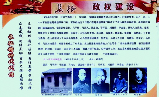 武山,是一方具有优良革命传统的红色热土。从1935年9月到1936年10月,中国工农红军陕甘支队,红二、红四方面军先后从武山经过,留下了北上抗日、救国救民的红色历史印记。红四方面军在武山县鸳鸯镇颉家门村成立了天水第一个苏维埃政府,也是红军在天水建立的唯一一个苏维埃政权——武山县苏维埃政府。