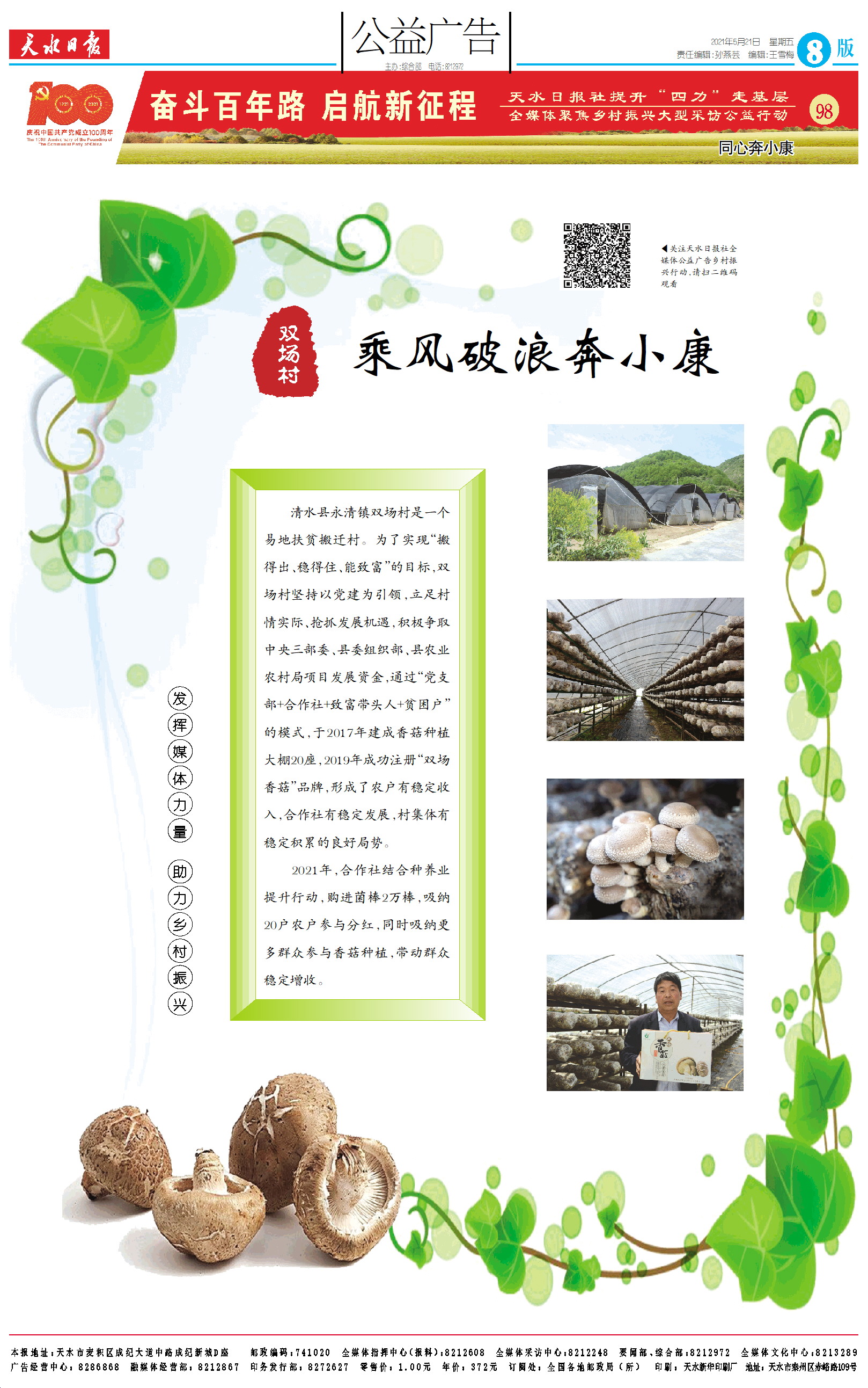 清水县永清镇双场村是一个易地扶贫搬迁村。为了实现“搬得出、稳得住、能致富”的目标,双场村坚持以党建为引领,立足村情实际、抢抓发展机遇,积极争取中央三部委、县委组织部、县农业农村局项目发展资金,通过“党支部+合作社+致富带头人+贫困户”的模式,于2017年建成香菇种植大棚20座,2019年成功注册“双场香菇”品牌,形成了农户有稳定收入,合作社有稳定发展,村集体有稳定积累的良好局势。