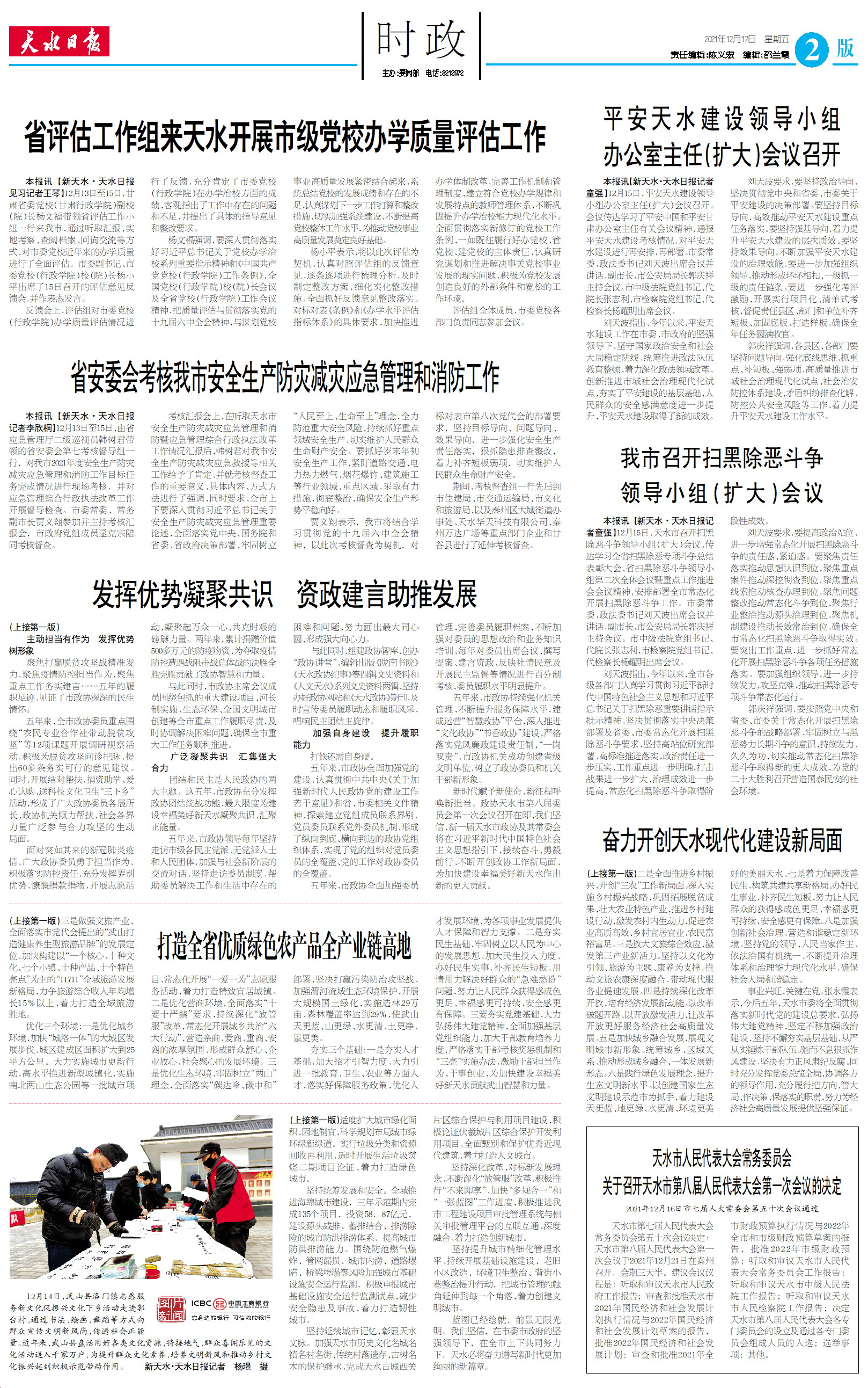 (上接第一版)二是全面推进乡村振兴,开创“三农”工作新局面。深入实施乡村振兴战略,巩固拓展脱贫成果,壮大农业特色产业,推进乡村建设行动,激发农村内生动力,促进农业高质高效、乡村宜居宜业、农民富裕富足。三是放大文旅综合效应,激发第三产业新活力。坚持以文化为引领、旅游为主题、康养为支撑,推动文旅农康深度融合,带动现代服务业提速发展。四是持续深化改革开放,培育经济发展新动能。以改革破题开路,以开放激发活力,让改革开放更好服务经济社会高质量发展。五是加快城乡融合发展,展现文明城市新形象。统筹城乡、区域关系,推动形成城乡融合、一体发展新形态。六是践行绿色发展理念,提升生态文明新水平。以创建国家生态文明建设示范市为抓手,着力建设天更蓝、地更绿、水更清、环境更美好的美丽天水。七是着力保障改善民生,构筑共建共享新格局。办好民生事业,补齐民生短板,努力让人民群众的获得感成色更足、幸福感更可持续、安全感更有保障。八是加强创新社会治理,营造和谐稳定新环境。坚持党的领导、人民当家作主、依法治国有机统一,不断提升治理体系和治理能力现代化水平,确保社会大局和谐稳定。