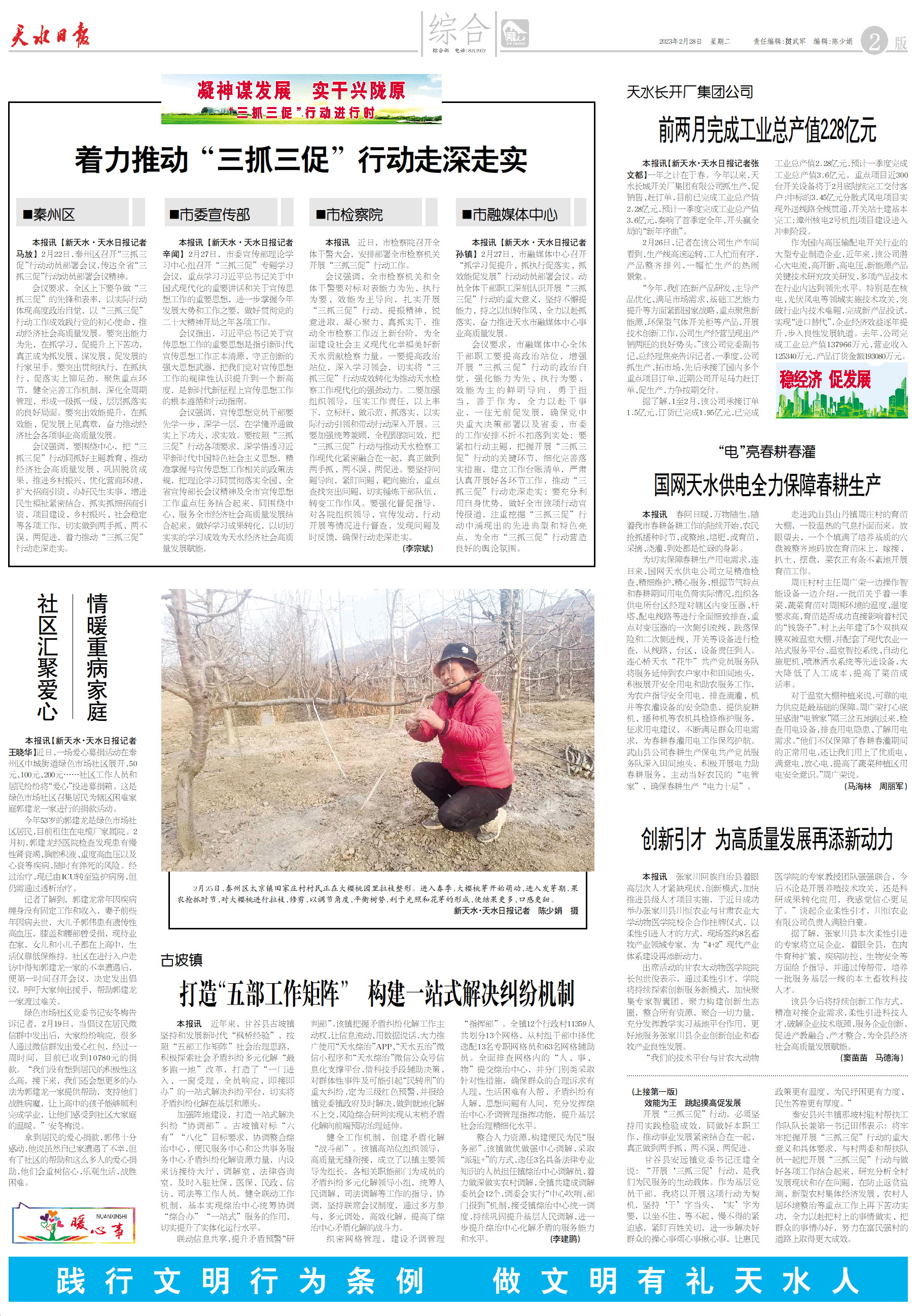 ■秦州区 本报讯【新天水·天水日报记者马放】2月22日,秦州区召开“三抓三促”行动动员部署会议,传达全省“三抓三促”行动动员部署会议精神。 会议要求,全区上下要争做“三抓三促”的先锋和表率,以实际行动体现高度政治自觉,以“三抓三促”行动工作成效践行党的初心使命、推动经济社会高质量发展。要突出能力为先,在抓学习、促提升上下苦功,真正成为抓发展、谋发展、促发展的行家里手。要突出贯彻执行,在抓执行、促落实上铆足劲,聚焦重点环节,健全完善工作机制,深化全周期管理,形成一级抓一级、层层抓落实的良好局面。要突出效能提升,在抓效能、促发展上见真章,奋力推动经济社会各项事业高质量发展。 会议强调,要围绕中心,把“三抓三促”行动同抓好主题教育、推动经济社会高质量发展、巩固脱贫成果、推进乡村振兴、优化营商环境、扩大招商引资、办好民生实事、增进民生福祉紧密结合,抓实抓细招商引资、项目建设、乡村振兴、社会稳定等各项工作,切实做到两手抓、两不误、两促进,着力推动“三抓三促”行动走深走实。 ■市委宣传部 本报讯【新天水·天水日报记者辛闻】2月27日,市委宣传部理论学习中心组召开“三抓三促”专题学习会议,重点学习习近平总书记关于中国式现代化的重要讲话和关于宣传思想工作的重要思想,进一步掌握今年发展大势和工作之要,做好贯彻党的二十大精神开局之年各项工作。 会议指出,习近平总书记关于宣传思想工作的重要思想是指引新时代宣传思想工作正本清源、守正创新的强大思想武器,把我们党对宣传思想工作的规律性认识提升到一个新高度,是新时代新征程上宣传思想工作的根本遵循和行动指南。 会议强调,宣传思想党员干部要先学一步、深学一层,在学懂弄通做实上下功夫、求实效。要按照“三抓三促”行动各项要求,深学悟透习近平新时代中国特色社会主义思想,精准掌握与宣传思想工作相关的政策法规,把理论学习同贯彻落实全国、全省宣传部长会议精神及全市宣传思想工作重点任务结合起来,同围绕中心、服务全市经济社会高质量发展结合起来,做好学习成果转化,以切切实实的学习成效为天水经济社会高质量发展赋能。 ■市检察院 本报讯 近日,市检察院召开全体干警大会,安排部署全市检察机关开展“三抓三促”行动工作。 会议强调,全市检察机关和全体干警要对标对表能力为先、执行为要、效能为王导向,扎实开展“三抓三促”行动,提振精神、锐意进取,凝心聚力、真抓实干,推动全市检察工作迈上新台阶,为全面建设社会主义现代化幸福美好新天水贡献检察力量。一要提高政治站位,深入学习领会,切实将“三抓三促”行动成效转化为推动天水检察工作现代化的强劲动力。二要加强组织领导,压实工作责任,以上率下,立标杆、做示范、抓落实,以实际行动引领和带动行动深入开展。三要加强统筹兼顾,全程跟踪问效,把“三抓三促”行动与推动天水检察工作现代化紧密融合在一起,真正做到两手抓、两不误、两促进。要坚持问题导向,紧盯问题、靶向施治,重点查找突出问题,切实锤炼干部队伍、转变工作作风。要强化督促指导,对各院组织领导、宣传发动、行动开展等情况进行督查,发现问题及时反馈,确保行动走深走实。 (李宗斌) ■市融媒体中心 本报讯【新天水·天水日报记者孙镇】2月27日,市融媒体中心召开“抓学习促提升、抓执行促落实、抓效能促发展”行动动员部署会议。动员全体干部职工深刻认识开展“三抓三促”行动的重大意义,坚持不懈提能力、持之以恒转作风、全力以赴抓落实,奋力推进天水市融媒体中心事业高质量发展。 会议要求,市融媒体中心全休干部职工要提高政治站位,增强开展“三抓三促”行动的政治自觉,强化能力为先、执行为要、效能为主的鲜明导向,勇于担当,善于作为,全力以赴干事业,一往无前促发展,确保党中央重大决策部署以及省委、市委的工作安排不折不扣落到实处;要紧扣行动主题,把握开展“三抓三促”行动的关键环节,细化完善落实措施,建立工作台账清单,严肃认真开展好各环节工作,推动“三抓三促”行动走深走实;要充分利用自身优势,做好全市该项行动宣传报道,注重挖掘“三抓三促”行动中涌现出的先进典型和特色亮点,为全市“三抓三促”行动营造良好的舆论氛围。