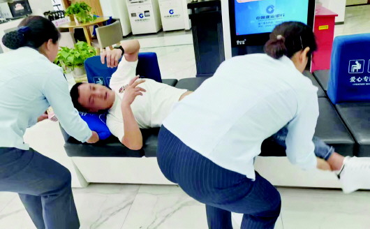 5月23日上午,建行甘谷支行营业大厅内一名客户突发疾病晕厥,网点员工迅速拨打“120”并第一时间进行救助,最终客户转危为安。面对突发事件,建行员工快速冷静的处置得到在场群众的一致赞扬。 席博 摄