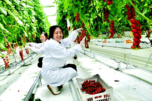 7月25日,在张家川回族自治县中部蔬菜产业示范基地里,工人正在采摘樱桃番茄。5月,该基地引进荷兰瑞克斯旺串收樱桃番茄,现已陆续成熟上市,采摘期可持续到明年5月,预计年产量可达100吨,年产值600万元左右。