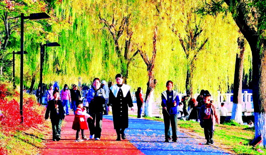 深秋时节,武山县宁远生态园落英缤纷、水波微澜,成为游人休闲打卡的好去处。人们扶老携幼,徜徉其间,尽情享受惬意的秋日暖阳,感受城市发展带来的美好生活。