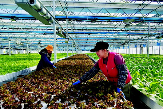 这些水培蔬菜属于无公害绿色食品,通过营养液提供水分、养分,营养价值更高且口感更好,两个月左右就可以长出一茬,省去了除草、翻土等人力成本,极大地节省了劳动力。