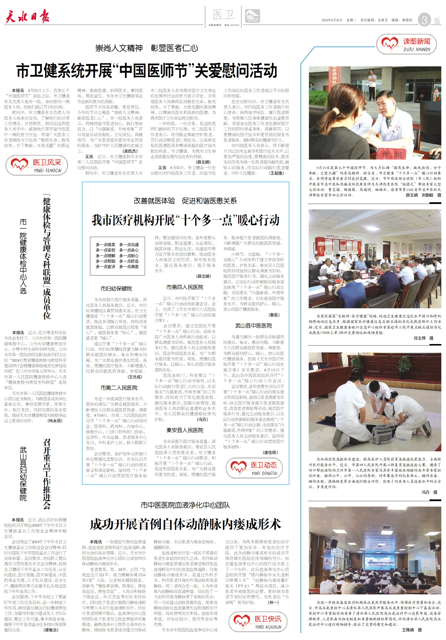 多一点微笑 多一点沟通 多一点安慰 多一点关心 多一点理解 多一点耐心 多一点帮助 多一点舒适 多一点宣讲 多一点满意 市妇幼保健院 为全面提升医疗服务质量,深化医务人员服务意识,近日,市妇幼保健院认真贯彻落实省、市卫生健康委“十个多一点”暖心行动要求,推出多项暖心举措,持续改善就医体验,让群众就医过程更“省心”、就医服务更“贴心”、就医感受更“暖心”。 通过开展“十个多一点”暖心行动,市妇幼保健院将着力解决好群众就医的堵点、难点和痛点问题,为广大群众提供更加优质、高效、便捷的医疗服务,不断增强人民群众的就医获得感、幸福感。 (王元成) 市第二人民医院 为进一步提高医疗服务水平,更好的满足广大群众就医需求,不断增加人民群众就医获得感、满意度,8月16日,市第二人民医院组织召开“十个多一点”暖心行动培训会。医保科、药剂科、内镜中心、体检中心、门诊口腔科和门诊部、急诊科、中央运输、患者服务中心及内、外科系护士长、新入职职工参加。 会议要求,各护理单元和窗口单位要强化思想认识,充分认识开展“十个多一点”暖心行动的现实意义和深远影响,坚持将“十个多一点”暖心行动贯穿医疗服务始终;要加强培训宣传,各科室要从法律法规、职业道德、从业准则、就医环境、职业礼仪、沟通技巧等方面开展全员培训教育,推动医务人员规范文明用语,树牢服务理念,强化服务意识,提升服务水平。 (薛文娟) 市第四人民医院 近日,市四院开展了“十个多一点”暖心行动动员部署会议。会上,宣读了《天水市第四人民医院开展“十个多一点”暖心行动实施方案》。 会议要求,通过在医院开展“十个多一点”暖心行动,动员全院广大医务人员积极行动起来,以群众满意为目标,规范医务人员服务行为,强化医务人员主动服务意识,促进和谐医患关系,为广大群众提供更为优质、高效、便捷的医疗服务,让暖心、贴心的医疗服务落到实处。 医院各部门、科室要以“十个多一点”暖心行动为契机,以实际行动践行医者仁心的宗旨。全面落实“内强素质、外树形象”的工作要求,持续致力于优化就医流程,强化服务意识,加强内部管理,提高医务人员的职业道德和业务水平,为人民群众的健康福祉保驾护航。 (冯垚) 秦安县人民医院 为全面提升医疗服务质量,深化医务人员服务意识,秦安县人民医院深入贯彻落实省、市卫健委“十个多一点”暖心行动要求,积极开展“十个多一点”暖心行动,促进和谐医患关系,为广大群众提供更为优质、高效、便捷的医疗服务,稳步提升患者就医的满意度,不断增强广大群众的就医获得感、幸福感。 小细节,大温暖,“十个多一点暖心”行动有利于建立和谐友好的医患、护患关系。秦安县人民医院将持续坚持以群众满意为目标,规范医疗服务行为,强化主动服务意识,以实际行动和崭新的服务姿态体现“十个多一点”暖心行动主题,全面落实“内强素质、外塑形象”的工作要求,切实提高医疗服务水平,为群众提供舒心、暖心、放心的医疗健康服务。 (秦医) 武山县中医医院 为着力解决一批群众反映强烈的堵点、难点、痛点问题,不断提升人民群众就医获得感、满意度,为群众提供舒心、暖心、放心的医疗健康服务,按照《天水市医疗机构开展“十个多一点”暖心行动实施方案》有关要求,8月13日下午,武山县中医医院组织召开“十个多一点”暖心行动工作会议。 会议要求,各科室要充分认识开展“十个多一点”暖心行动的现实意义和深远影响,坚持以患者满意为目标,结合医疗服务提升患者就医感受、改善患者体验等活动,规范医疗服务行为,强化主动服务意识,以实际行动和崭新的服务姿态体现“十个多一点”暖心行动主题,全面落实“内强素质、外塑形象”的工作要求,强化医务人员主动服务意识,坚持将“十个多一点”暖心行动贯穿医疗服务始终。 (康佳琪)