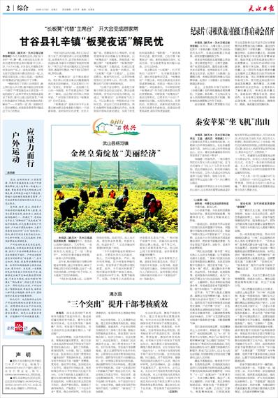 本报讯【新天水·天水日报通讯员管秋勇 杨耀斌】当下,走进武山县杨河镇赵河、王河等村,一朵朵金灿灿的金丝皇菊迎风绽放,给深秋的大地披上了一层“黄金甲”,村民们忙着采摘金丝皇菊,一派喜人的丰收景象。