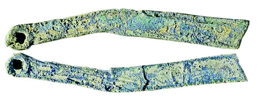 天水市博物馆馆藏的战国明刀是磬折明刀的一种,刀身与刀柄连接处为方折,状似古磬缘,又称“方折刀”。其刀首较窄,刀刃较钝,刃部已成直线,刀脊弧度小且中断,刀柄直纹深入刀身。该战国刀币长13.7厘米,宽1.5厘米,重30.0克。面文“明”字已固定在面,是“明”的象形文字。燕明刀背文十分繁杂,文字多为记数、记状、记物,或单字、双字、多字;另有记多种符号者,品种超过百余种。有学者分析认为,这些背文可能是区别炉次和钱范次序的一种标志。