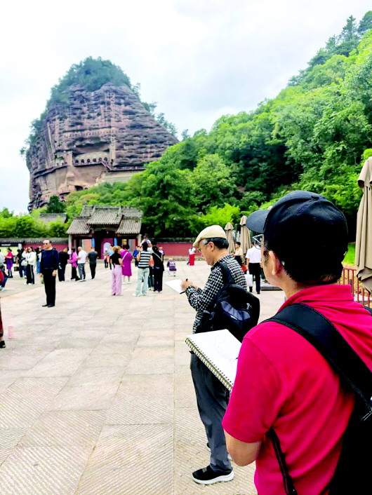 天高气清,秋色澄明。在“陇上江南”秋实累累的最美季节,中国经济体制改革研究会共建“一带一路”专业委员会主任、丝绸之路城市联盟执行主席宋荣华率丝盟美术馆馆长李鸣泉和何东、王其华、索铁生等中国著名书画家一行,赴天水考察调研,为“丝绸之路城市联盟美术馆天水创作交流基地”举行揭牌仪式,在“羲皇故里”奏响了一场古今对话的丝路新乐章。 9月14日清晨,“丝绸之路城市联盟美术馆天水创作交流基地”揭牌仪式,在各界代表的见证下举行。 中国文化宣传推广大使王晓琴在欢迎辞中介绍,丝绸之路城市联盟由国内外知名人士发起,成立于2014年,以推动“一带一路”沿线城市多领域合作,促进共同发展繁荣为宗旨,是“城市的纽带,合作的桥梁”。丝盟美术馆则致力于组织国内外书画艺术家参与丝路文化艺术交流,推动文明互鉴与文化繁荣。 天水作为丝绸之路黄金路段的重要组成部分,是古丝绸之路东段的关键节点。宋荣华在致辞中说:“天水这座丝绸之路西出长安后的第一重镇,从来就不仅仅是地图上的一个地理坐标。千百年来,它是商旅驼铃悠悠回荡的关键通道,是多元文化交汇融合的重要熔炉。从麦积山石窟‘东方微笑’所蕴含的艺术融合与精神对话,到出土文物上记载的粟特商旅与中原文明的往来故事,天水的土壤里,早已深深植入了开放、交流与创新的基因。”他表示,“在这里设立创作交流基地,正是为了赓续这份历史的荣光与使命,为天水这座历史文化名城注入新时代活力,推动文旅融合和经贸合作,赋能城市发展,使天水成为‘新丝绸之路经济带’上的璀璨明珠”。 揭牌仪式结束后,大家先后拜谒和游览了伏羲庙、胡氏民居南宅子、天水66号文化创意园。 走进历经500多年历史的伏羲庙,古树古建、匾额木雕无不烙印着伏羲文化的历史渊源,彰显着华夏文明的独特魅力。中华人文始祖伏羲的创世精神仿佛穿越了八千年时空,深深叩击着每一位参拜者的心灵。作为中华民族心智的启蒙者、文明进程的开拓者,伏羲造书契以代结绳、结网罟以教渔猎、制嫁娶以立人伦、定历法以授农时,更以一画开天、始创八卦的伟绩,将中华民族从蒙昧引向光明,开启了华夏文明。这源远流长的文明血脉,也正是当代艺术家汲取灵感,进行创造性转化创新性发展的精神纽带。 “这已经是我第30次来到天水伏羲庙了。”出生于河南周口的三栖艺术家李鸣泉动情地说,“天水是‘羲皇故里’,河南是‘羲皇故都’,两地同根同源,文脉相连。每一次来到这里,站在先祖开创文明的这片圣土上,都会有新的感悟和收获”。 也许正是这种感悟,让李鸣泉一次又一次来到天水,沉醉于类似家乡的氛围之中,走街串巷、访村问户,细细寻觅着故乡的元素,一笔笔画下他的所见所感。最终汇聚成2014年于天水市文化馆举办的《消失的故乡之西部人家》国画创作观摩展,并以其风格鲜明、意境深远、中西合璧、极具浓郁东方诗意和乡土情怀的特色,至今仍令观展者记忆犹新。 沐浴着午后的暖阳,大家来到了“陇上第一民居”——胡氏民居南宅子。这里是明代山西按察司副使胡来缙的私宅,属于典型的明代古民居建筑群,其建筑布局严谨,木雕、砖雕、石雕精美绝伦,充分展示了古代天水人民高超的建筑技艺和独特的审美情趣。2003年,由天水市博物馆负责维修后,建成了天水民俗博物馆。 大家兴致勃勃地游览了桂馥院、槐荫院、凌霄院等精美典雅的古民居院落,观赏了丰富多彩的民俗文物和国家级非物质文化遗产——西秦腔皮影戏。 当来到杨家楼院(天水古楼),摄影师抓拍到两位“丝盟”助理——北京青年陈子康和天水籍姑娘赵慧子在楼上凭栏远眺的生动照片时,古老的丝绸之路仿佛在这一刻被赋予了青春的注脚。引得众人赞不绝口,纷纷登楼拍照留念。 随后代表团一行又探访了位于砚房背后66号贾家公馆的天水66号文化创意园,这里与南宅子的古朴形成鲜明对比,是天水文化“双创”的活力现场。园内汇集了泥塑、扎染、数字书法等创意工坊,开发的“福禧”系列文创产品巧妙地将伏羲文化等“天水元素”融入现代设计,让人能将天水的文化记忆“可消费、可体验、可带走”。 一古一新,两次探访,仿佛完成了与天水的一次深度对话,让大家既沉醉于其深厚的历史底蕴,也惊叹于其蓬勃的创意新生。 次日,丝绸之路城市联盟代表团在天水市文联副主席孙德虎陪同下,循着历史的足音与果香的指引,先后造访了麦积山石窟与麦积区南山“花牛”苹果产业基地,展开了一段融汇艺术、历史与乡土风物的诗意之旅。 车到麦积山下,画家们纷纷拿出速写本,勾画起了这座艺术宝库。只见天津美术学院何东教授用他灵动而富有魅力的线条,不一会儿就流畅地勾勒出了麦积山的轮廓。令人不禁遐想:在他的独特技法——线墨交融之后的《麦积烟雨》画作,该是多么精美绝伦、气韵生动! 天公作美,不一会儿就下起了小雨,且越下越大,这是麦积山游客最难遇,又最向往的情景。烟雨迷蒙中,麦积山倏然换上了一袭空灵的面纱。雨丝斜织,山峦隐现于缥缈云雾之间,“麦积烟雨”的奇观不期而至。远望层峦叠嶂,犹如丹青水墨酣畅淋漓;近观石窟静穆,造像慈悲的眼眸仿佛在雨声中低语千年沧桑。代表团成员沿栈道徐行,不时驻足凝神,既惊叹于石窟艺术的精美绝伦,也沉醉于这雨意氤氲的自然幻