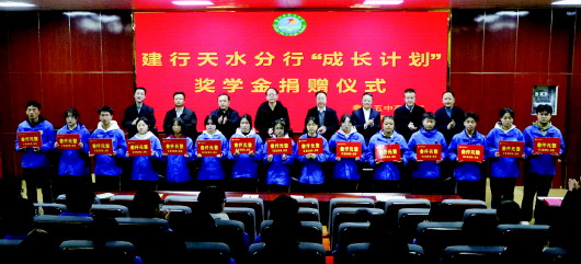 本报讯 11月18日,中国建设银行天水分行“高中生成长计划”奖学金捐赠仪式在秦安县第五中学举行,建行天水分行负责人为15名受助学生颁发了奖学金,发放总额4.5万元。