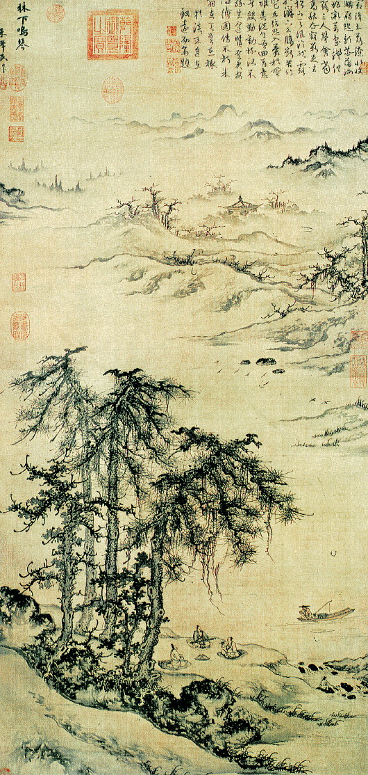 近岸的江边,三株大松树矗立,旁有杂树两棵。高松之下,三人盘腿坐在蒲团之上,一人双手放在琴上,眼睛左看,似乎正在与朋友交谈。一渔翁持桨轻曳而至,僮子则临流汲水,为主人备茶。中部,绘江天辽阔,愈远愈淡。远处,是隔岸的坡陀起伏、岗峦层立、烟雾空濛。显然——这是出于历史境遇、被边缘化的元代知识分子的实际生存状态,更是他们理想化的精神家园。