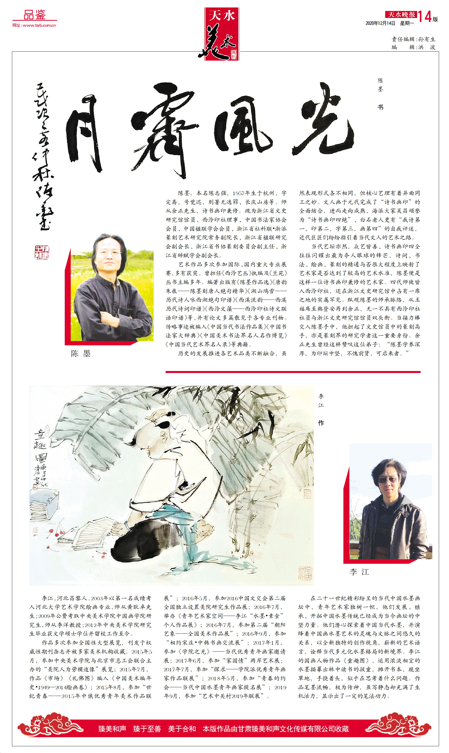 在二十一世纪精彩纷呈的当代中国水墨画坛中,青年艺术家独树一帜,他们发展、继承、开拓中国水墨传统已经成为当今画坛的中坚力量。他们潜心探索着中国当代水墨,并演绎着中国画水墨艺术的灵魂与文脉之间悠久的关系,以全新独特的创作视角,崭新的艺术语言,诠释当代多元化水墨格局的新境界。李江的国画人物作品《童趣图》,运用浓淡相宜的水墨描摹出林中读书的孩童,摊开书本,跪坐草地,手挠着头,似乎在思考着什么问题。作品笔墨流畅,极为传神,虽写静态却充满了生机活力,显示出了一定的笔法功力。