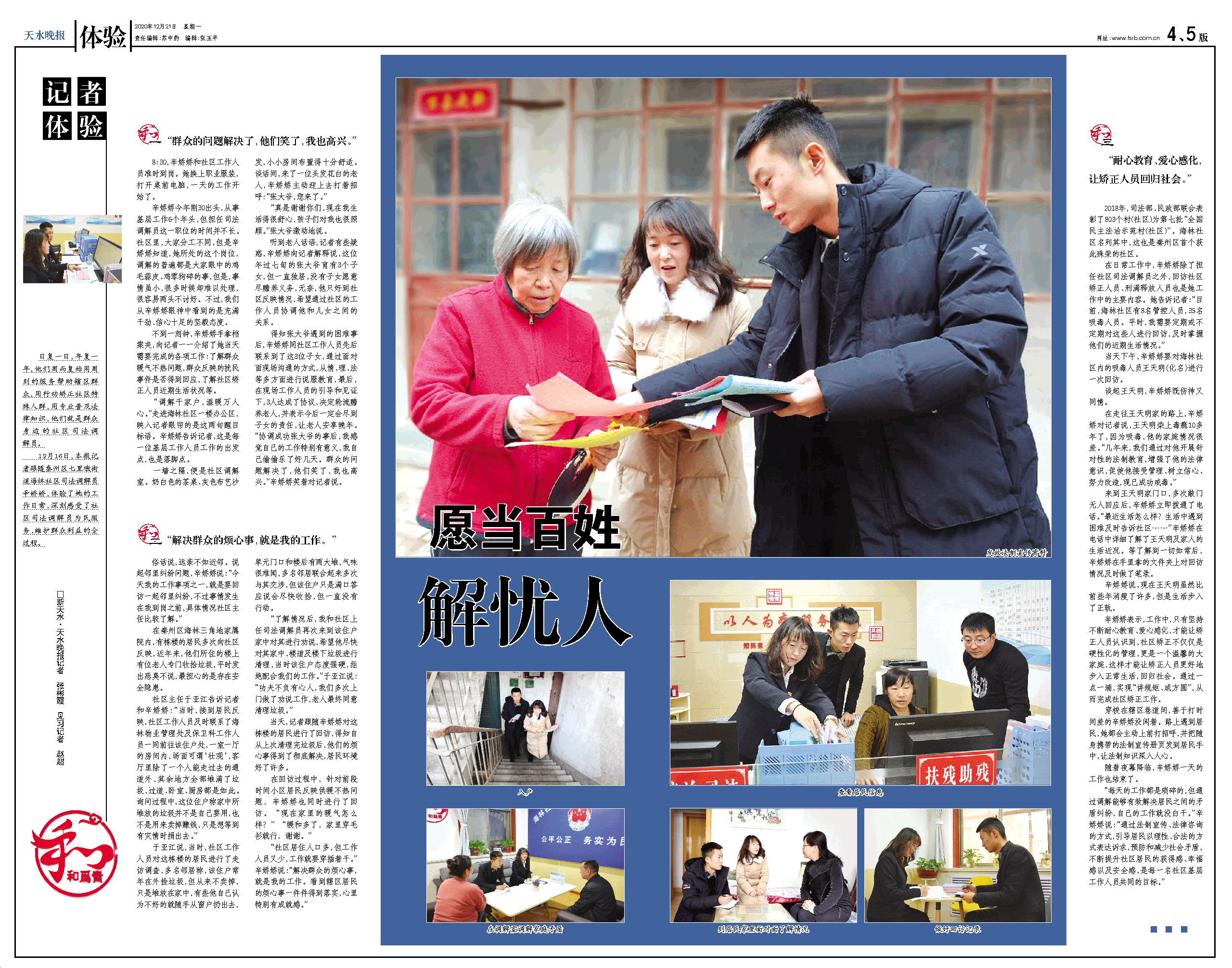 12月16日,本报记者跟随秦州区七里墩街道海林社区司法调解员辛娇娇,体验了她的工作日常,深刻感受了社区司法调解员为民服务、维护群众利益的全过程。