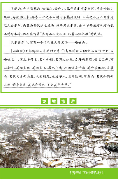 齐寿山,古名嶓冢山、崦嵫山、云台山,位于天水市秦州区,系秦岭迭山延脉,海拔1951米。齐寿山北之水入渭河系耤河流域,山南之水注入白家河汇入白水江,西麓为西汉水之源头,横跨两大水系,是中华母亲河黄河与长江的分水岭。因而盛传着“齐寿山不大不小,压着三江河垴”的民谣。