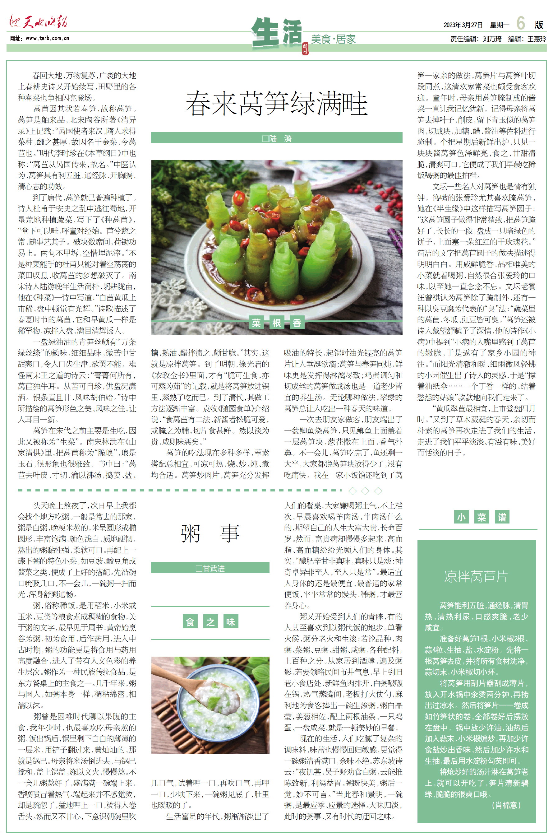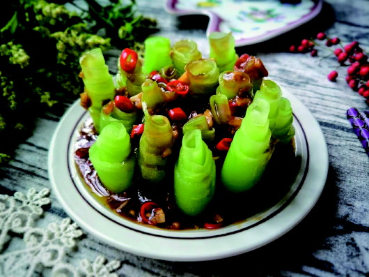 一盘绿油油的青笋丝颇有“万条绿丝绦”的韵味,细细品味,微苦中甘甜爽口,令人口齿生津,欲罢不能。难怪南宋王之道的诗云:“菁菁何所有,莴苣独牛耳。从苦可自珍,供盘况潇洒。银条直且甘,风味胡伯始。”诗中所描绘的莴笋形色之美、风味之佳,让人耳目一新。