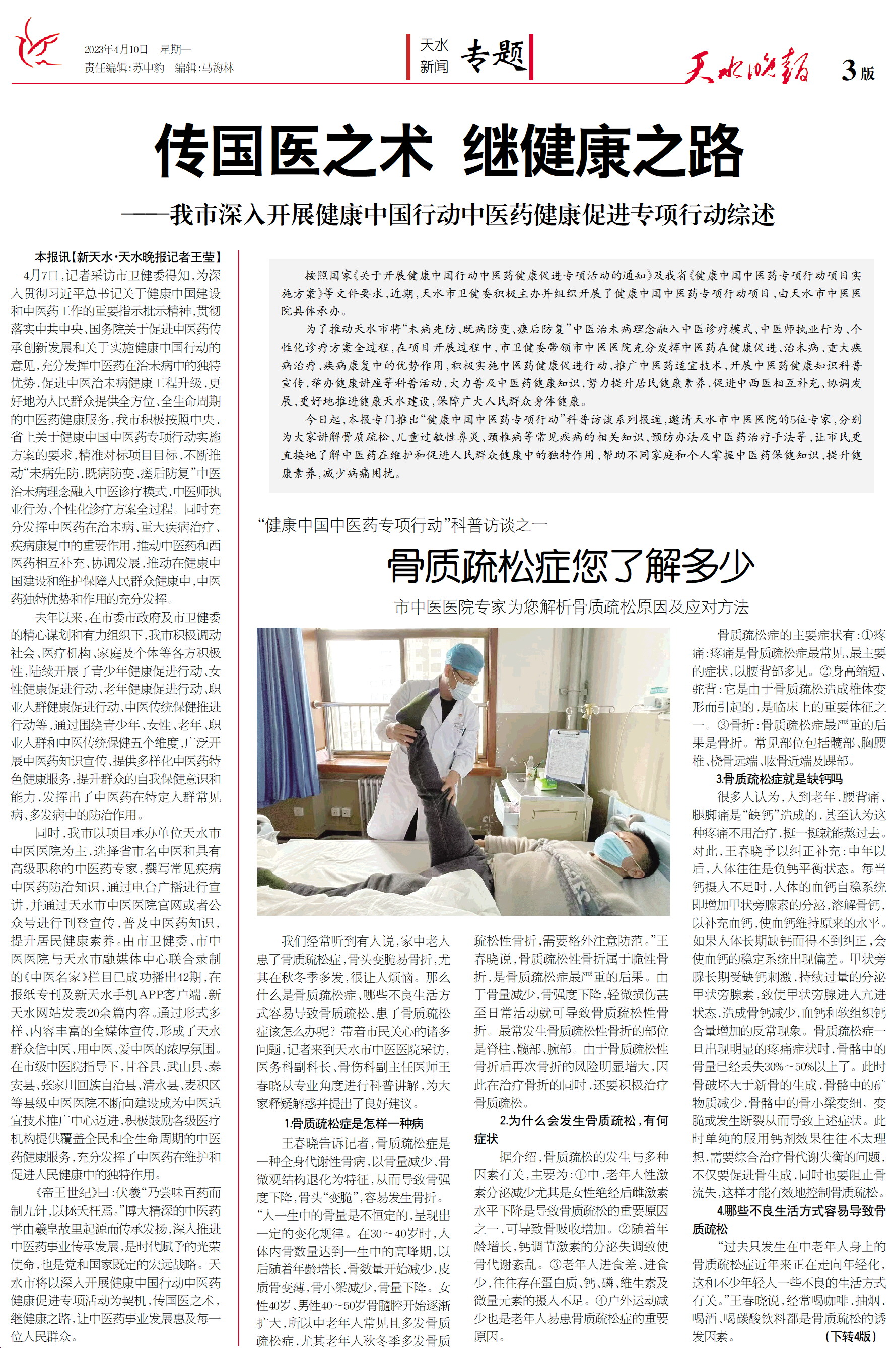 今日起,本报专门推出“健康中国中医药专项行动”科普访谈系列报道,邀请天水市中医医院的5位专家,分别为大家讲解骨质疏松、儿童过敏性鼻炎、颈椎病等常见疾病的相关知识、预防办法及中医药治疗手法等,让市民更直接地了解中医药在维护和促进人民群众健康中的独特作用,帮助不同家庭和个人掌握中医药保健知识,提升健康素养,减少病痛困扰。