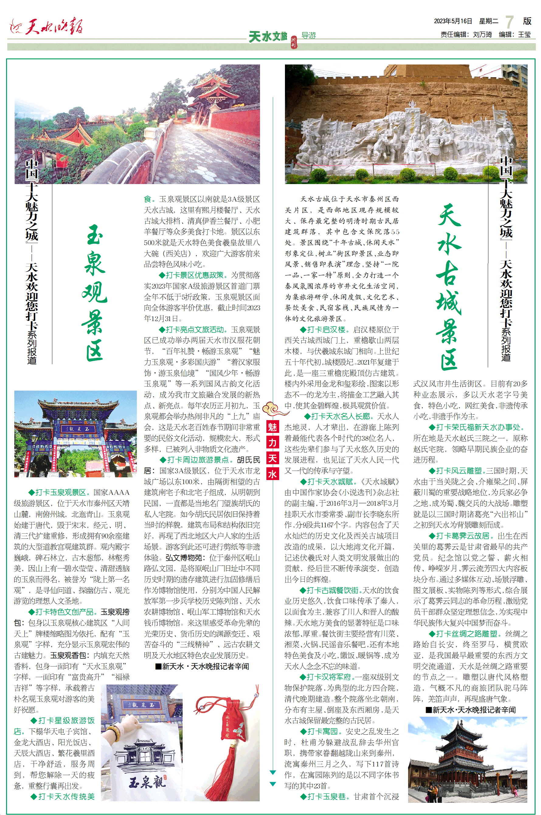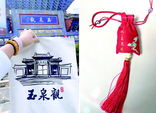 ◆打卡特色文创产品。玉泉观挎包:包身以玉泉观核心建筑区“人间天上”牌楼缩略图为依托,配有“玉泉观”字样,充分显示玉泉观宏伟的古建魅力。玉泉观香包:内填充天然香料,包身一面印有“天水玉泉观”字样,一面印有“富贵高升”“福禄吉祥”等字样,承载着古朴名观玉泉观对游客的美好祝愿。