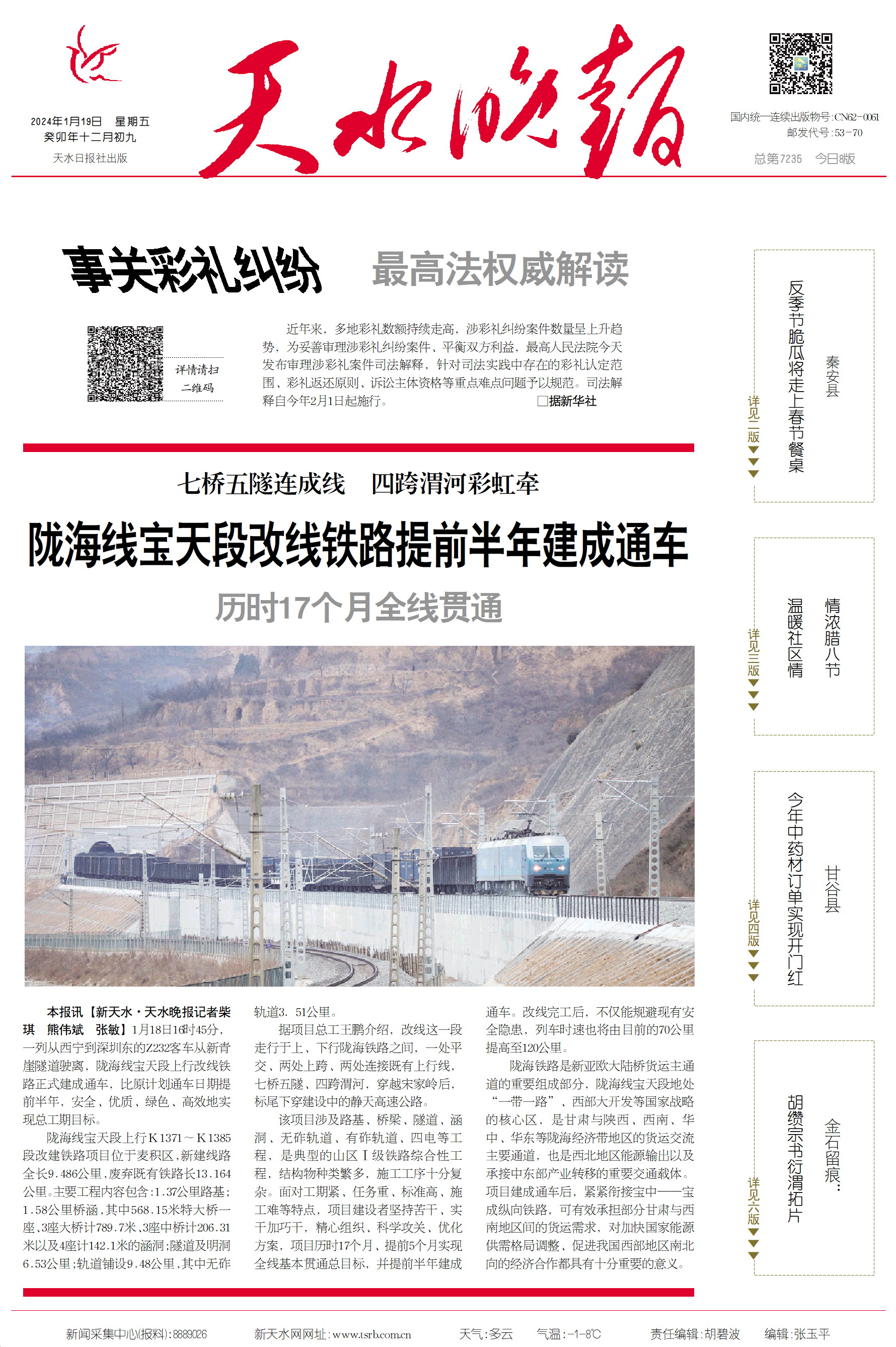 本报讯【新天水·天水晚报记者柴琪 熊伟斌 张敏】1月18日16时45分,一列从西宁到深圳东的Z232客车从新青崖隧道驶离,陇海线宝天段上行改线铁路正式建成通车,比原计划通车日期提前半年,安全、优质、绿色、高效地实现总工期目标。