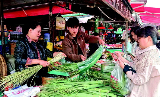 6月5日,端午临近,与端午节相关的商品销售火热。在麦积区仿古街里,许多摊位上摆放着粽叶和马莲,绿绿的粽叶用绳子一捆一捆地扎好,整齐地铺排开来。在粽叶区域旁边,还摆放了糯米、大枣、蜜枣、蜜豆、豆沙、坚果、咸鸭蛋等食材,充满了满满的节日气息,吸引不少市民前来购买。 麦融 摄