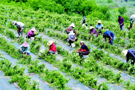 6月11日,清水县金集镇种植户正忙着采摘金银花。金集镇栽植的1400亩金银花今年喜获丰收,预计能采摘鲜花7万余斤,为农民增收70万元以上,金银花正逐步成为当地群众增产增收的“致富花”。 新天水·天水晚报记者周文涛 摄