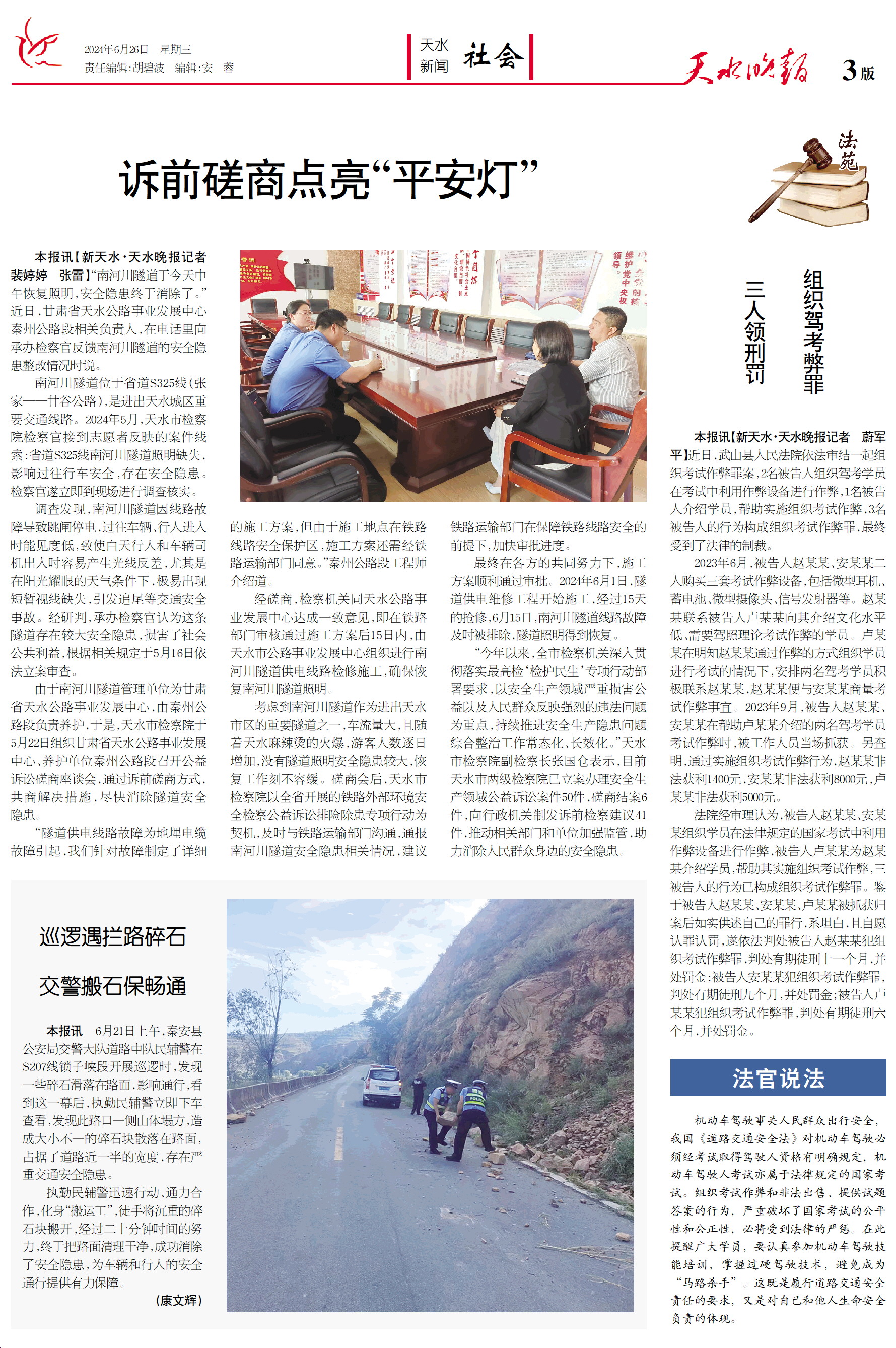 本报讯 6月21日上午,秦安县公安局交警大队道路中队民辅警在S207线锁子峡段开展巡逻时,发现一些碎石滑落在路面,影响通行,看到这一幕后,执勤民辅警立即下车查看,发现此路口一侧山体塌方,造成大小不一的碎石块散落在路面,占据了道路近一半的宽度,存在严重交通安全隐患。