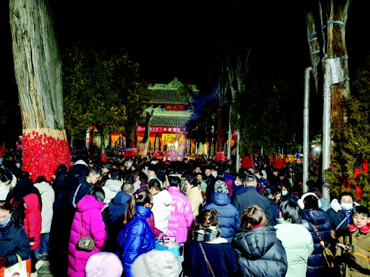 当晚,伏羲城内流光溢彩,人声鼎沸。晚上11时,在伏羲庙先天殿月台前进行了舞龙、旋鼓、夹板舞等民俗表演。祭祀典礼开始后,参祭人员依次走上先天殿月台,为乙巳(2025)年伏羲庙吉祥物揭彩,撞响了乙巳(2025)年平安钟,为全市人民祈福。随后主祭人、助祭人击鼓鸣钟,鸣炮奏乐,在伏羲圣像前行初献礼、亚献礼、终献礼,恭读祭文,敬献花篮,整个祭祀仪式神圣、庄重、肃穆。
