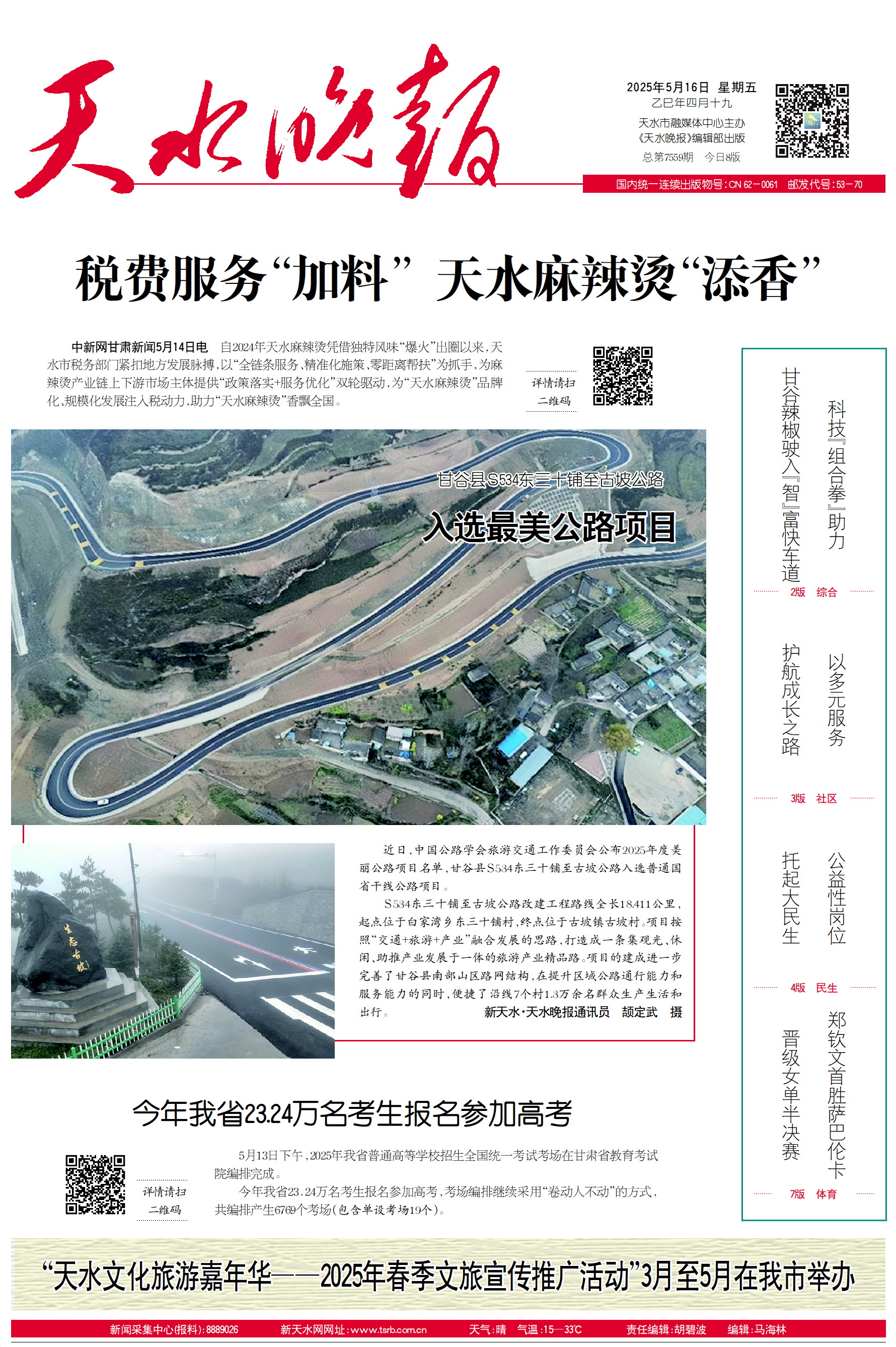 S534东三十铺至古坡公路改建工程路线全长18.411公里,起点位于白家湾乡东三十铺村,终点位于古坡镇古坡村。项目按照“交通+旅游+产业”融合发展的思路,打造成一条集观光、休闲、助推产业发展于一体的旅游产业精品路。项目的建成进一步完善了甘谷县南部山区路网结构,在提升区域公路通行能力和服务能力的同时,便捷了沿线7个村1.3万余名群众生产生活和出行。 新天水·天水晚报通讯员 颉定武 摄