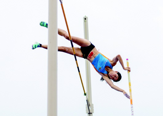 5月14日,安徽队选手牛春格在比赛中试跳。最终,她以4米50的成绩夺得冠军。
