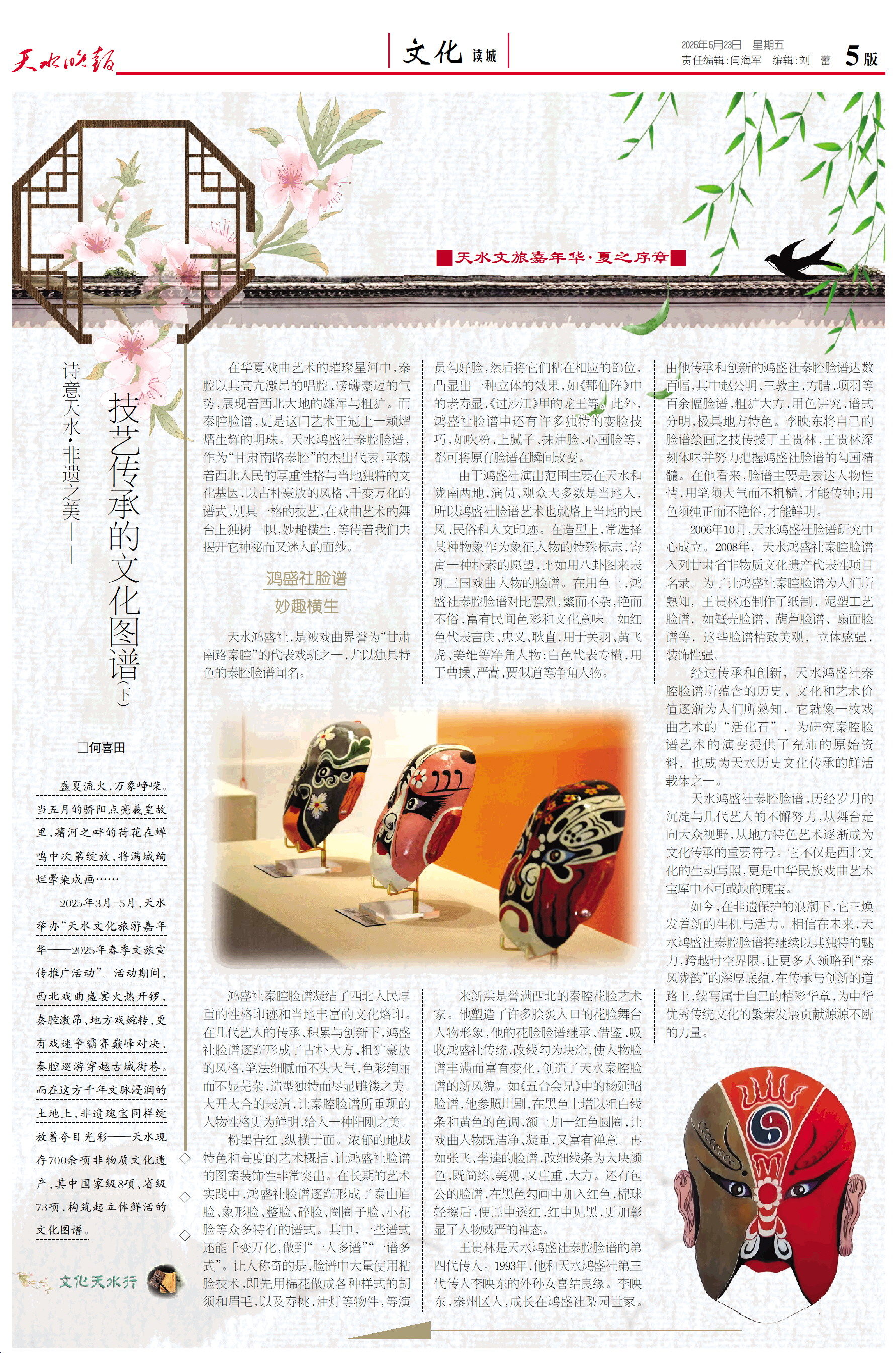 2025年3月-5月,天水举办“天水文化旅游嘉年华——2025年春季文旅宣传推广活动”。活动期间,西北戏曲盛宴火热开锣,秦腔激昂、地方戏婉转,更有戏迷争霸赛巅峰对决、秦腔巡游穿越古城街巷。而在这方千年文脉浸润的土地上,非遗瑰宝同样绽放着夺目光彩——天水现存700余项非物质文化遗产,其中国家级8项、省级73项,构筑起立体鲜活的文化图谱。