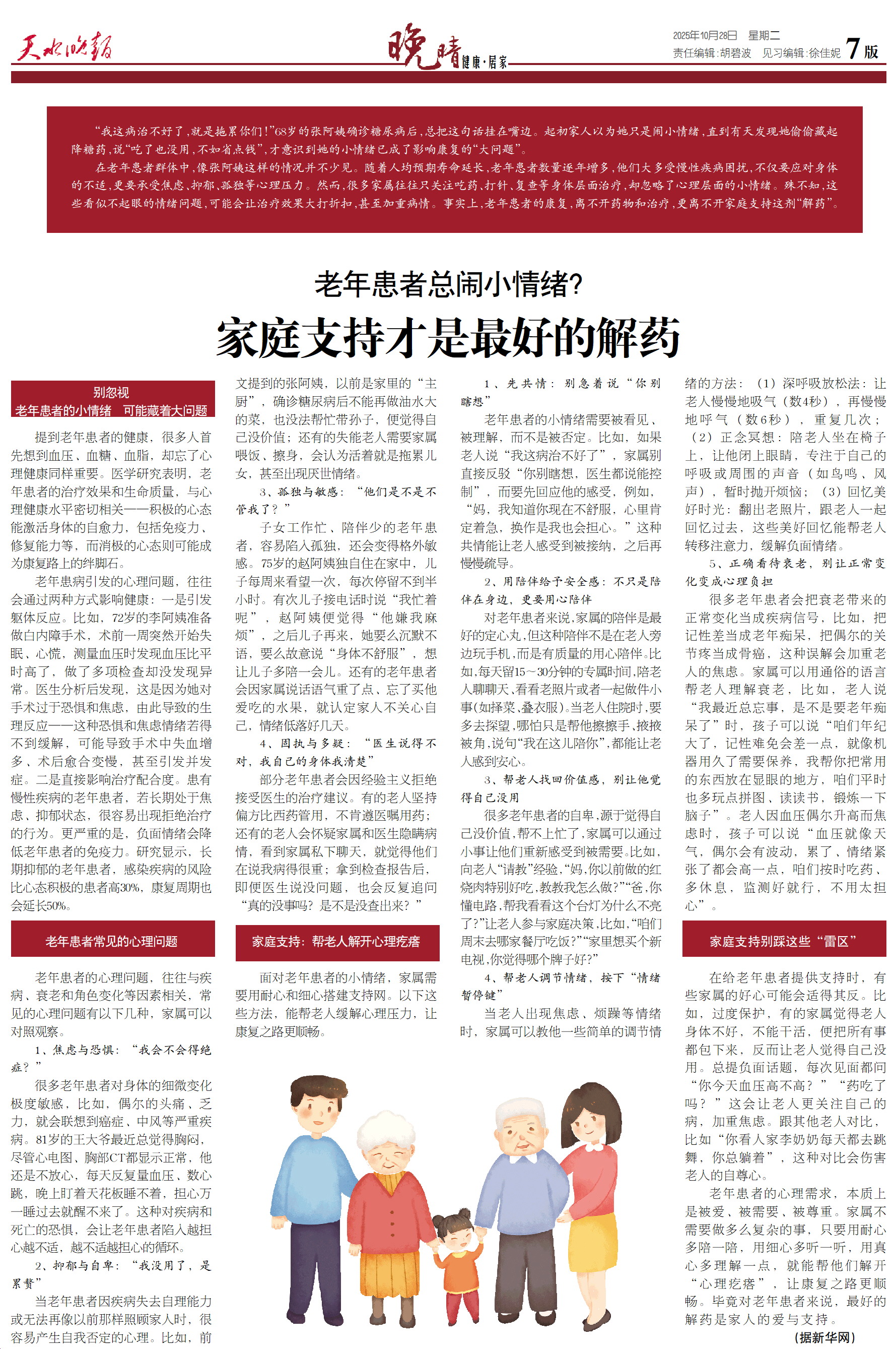 老年患者的心理需求,本质上是被爱、被需要、被尊重。家属不需要做多么复杂的事,只要用耐心多陪一陪,用细心多听一听,用真心多理解一点,就能帮他们解开“心理疙瘩”,让康复之路更顺畅。毕竟对老年患者来说,最好的解药是家人的爱与支持。 (据新华网)