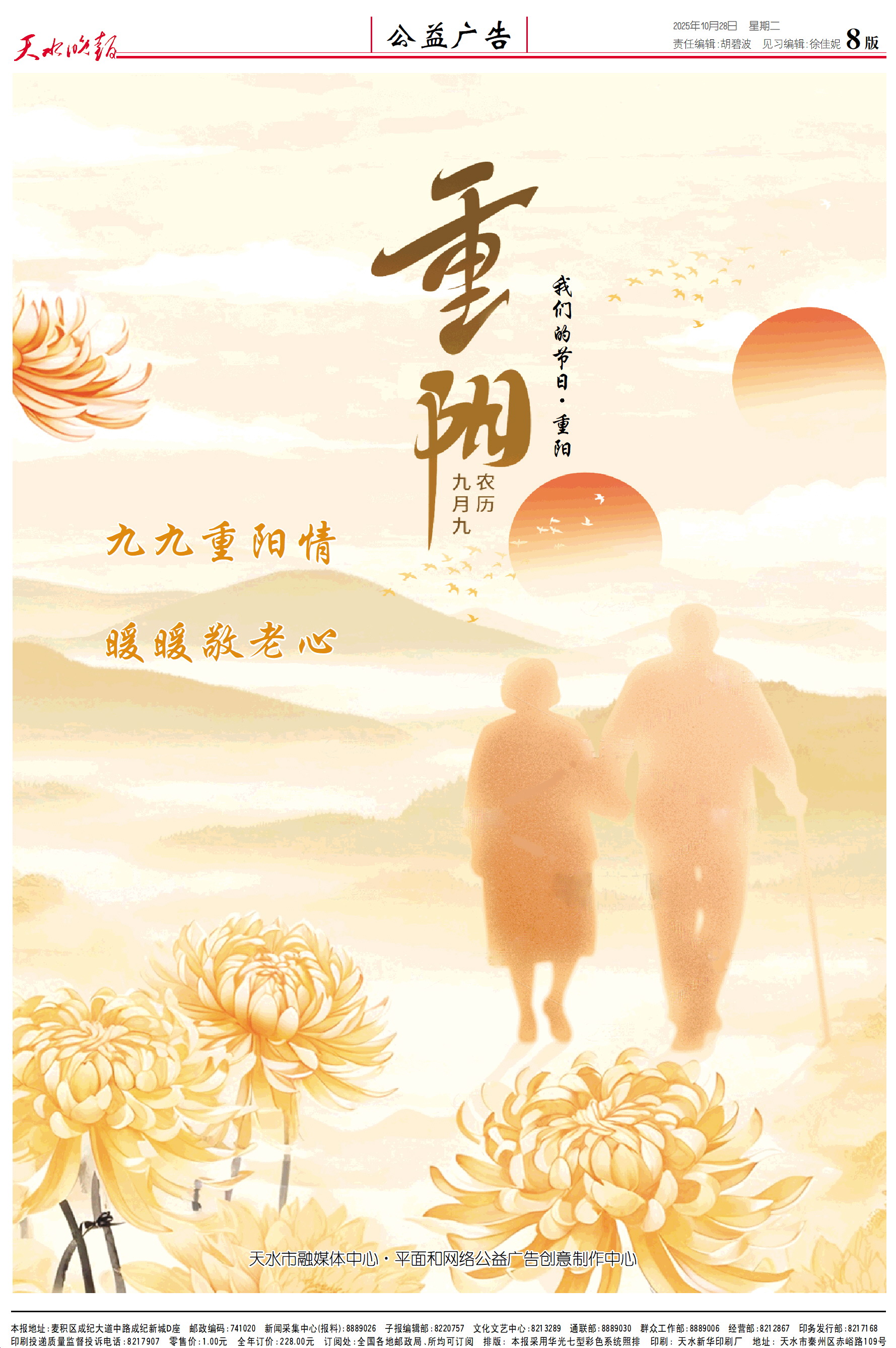 印刷投递质量监督投诉电话:8217907 零售价:1.00元 全年订价:228.00元 订阅处:全国各地邮政局、所均可订阅 排版:本报采用华光七型彩色系统照排 印刷:天水新华印刷厂 地址:天水市秦州区赤峪路109号