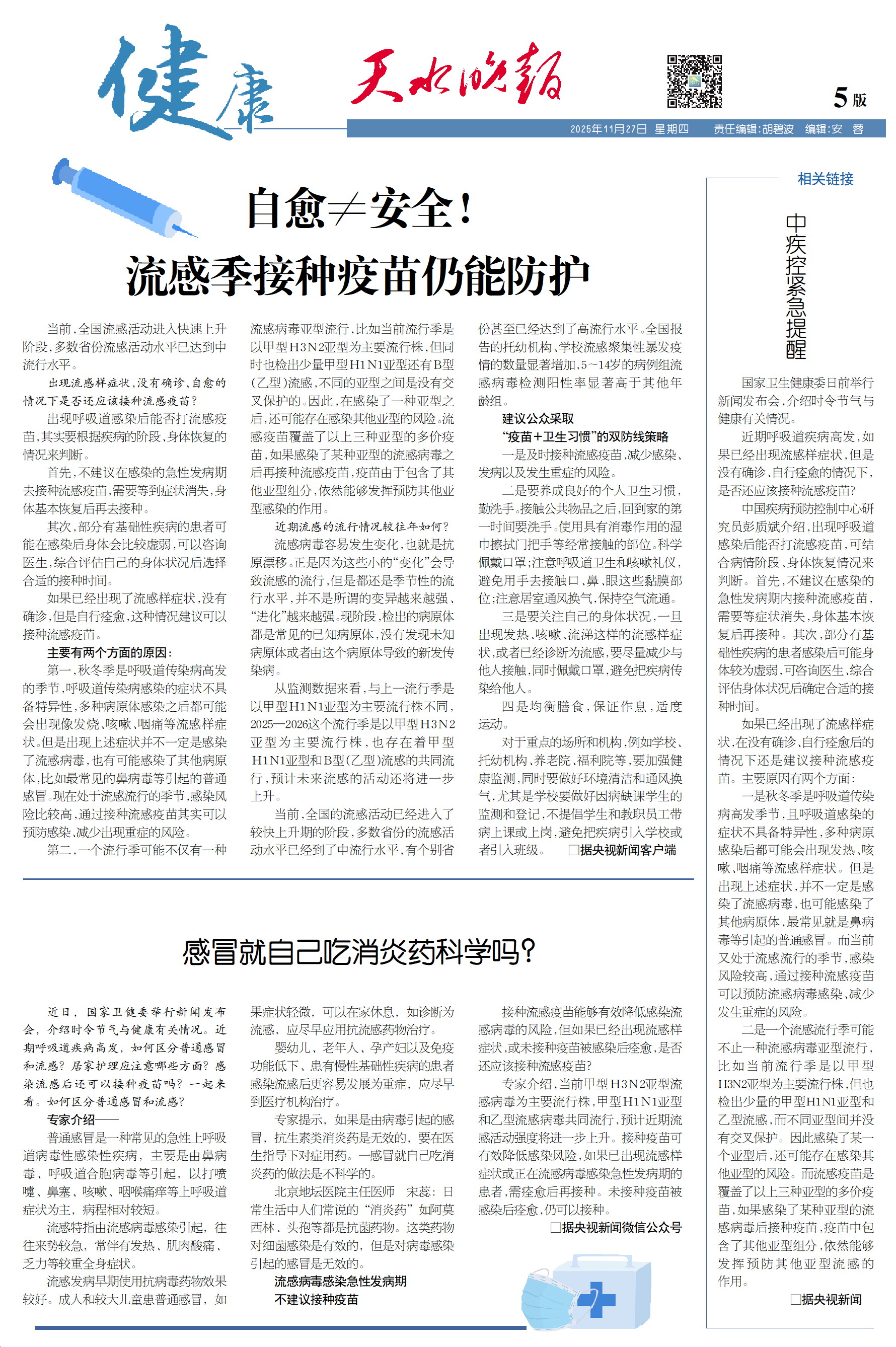 一是及时接种流感疫苗,减少感染、发病以及发生重症的风险。