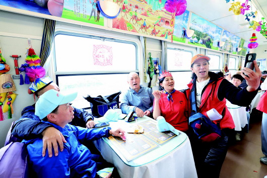 在“龙泰号”援疆银发旅游专列上,几名乘客合影留念。新华社发